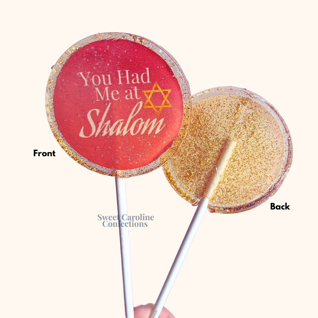 "You Had Me at Shalom" in a beautiful ombre edible image inside our signature clear sparkle candy. Gold sparkles throughout.