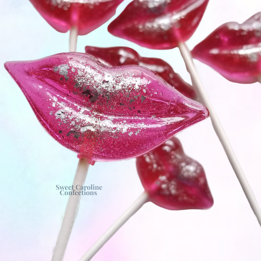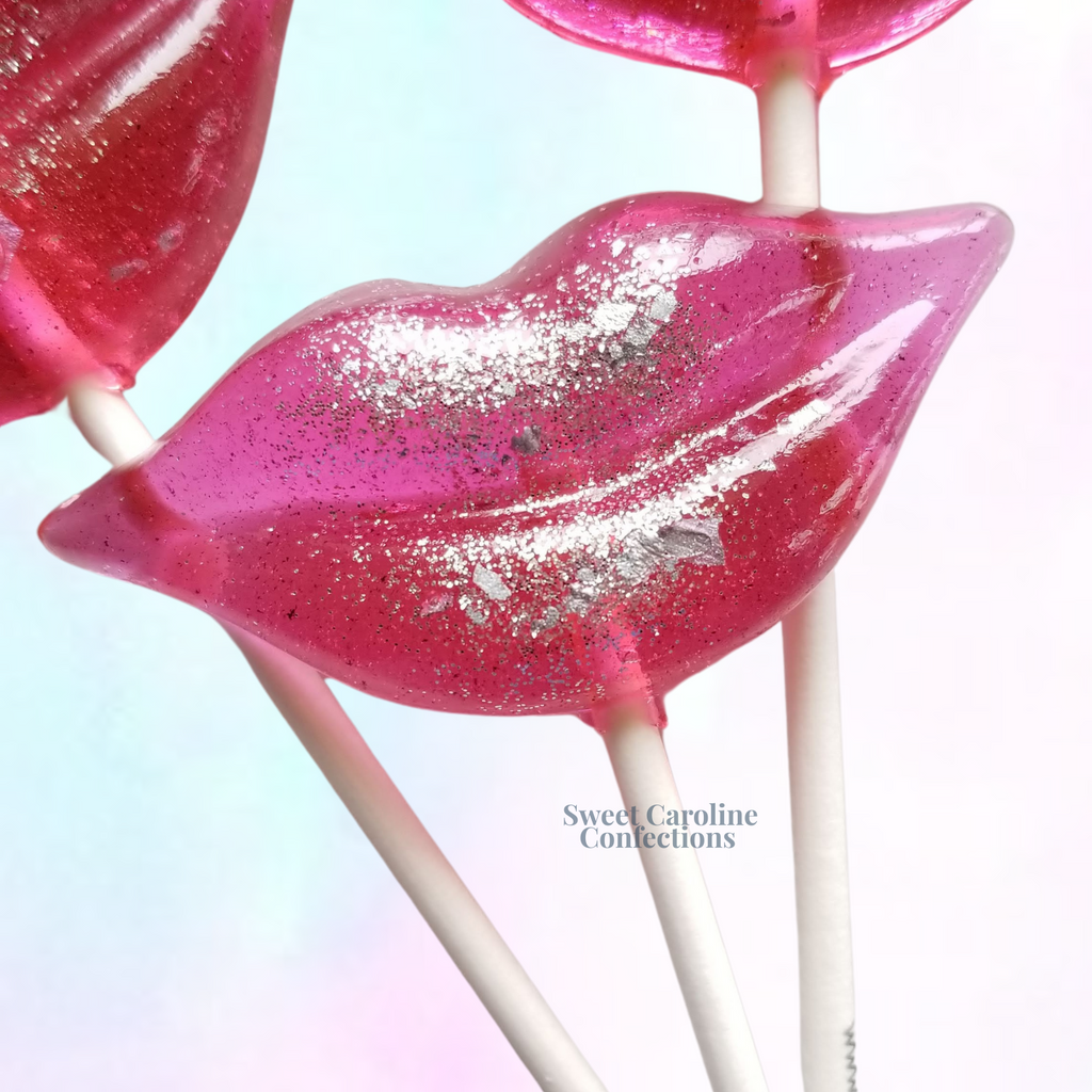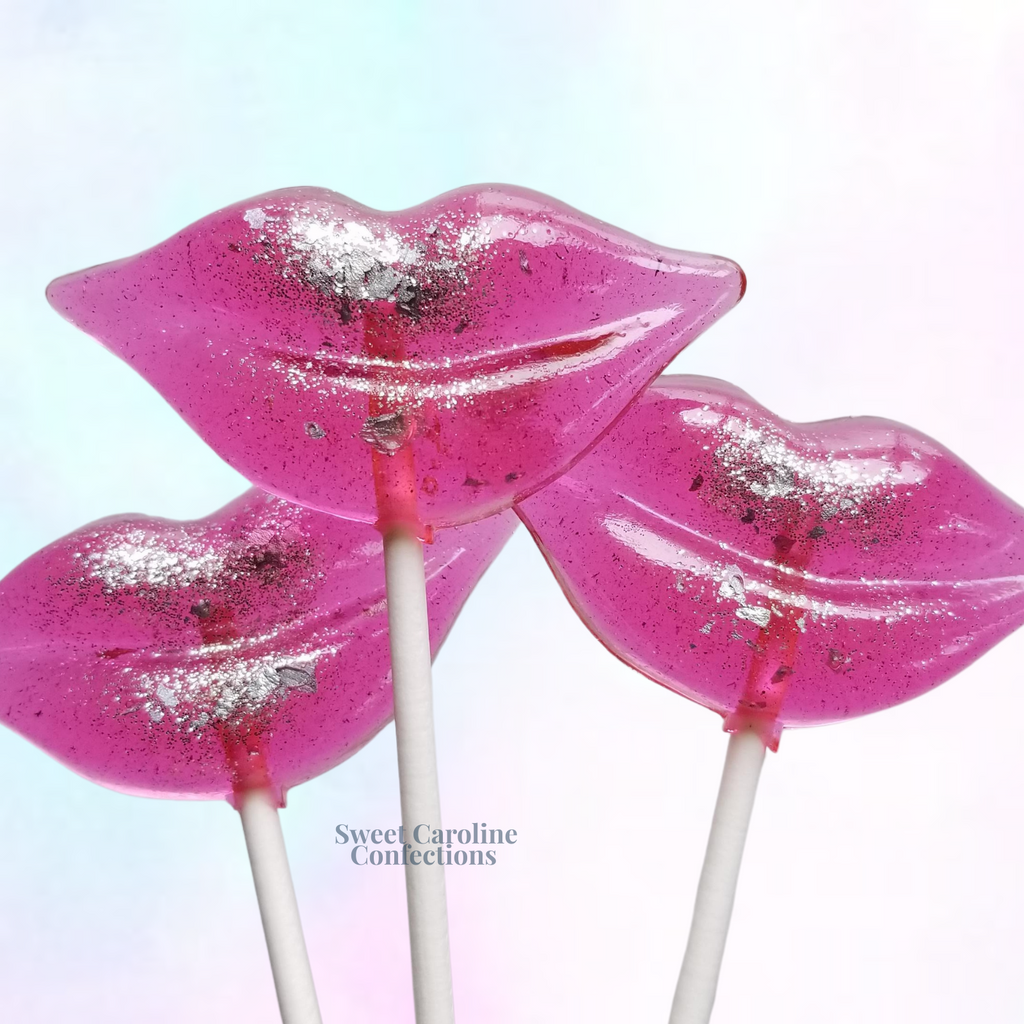 The perfect lip lollipops in a hot pink with silver flakes and edible glitter!