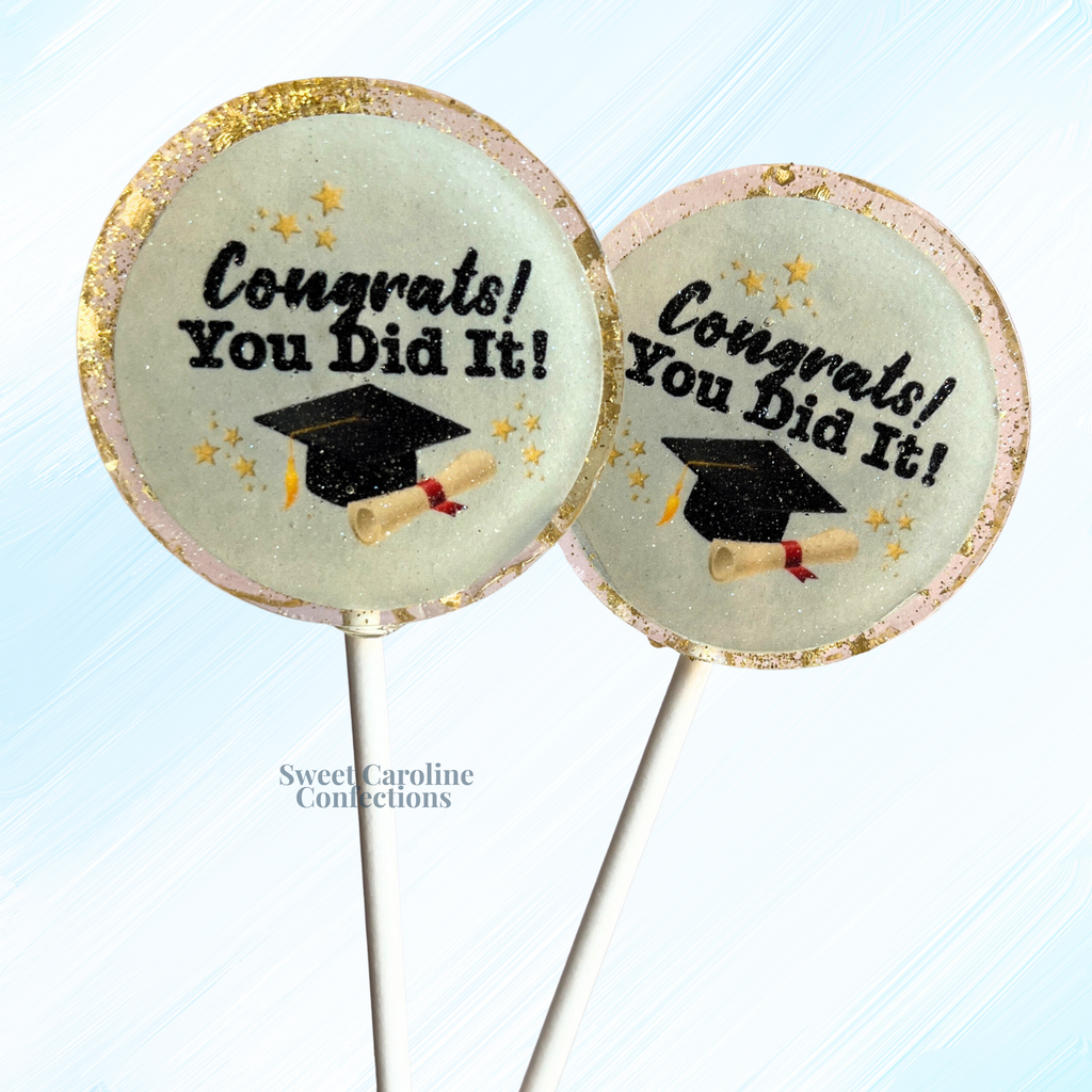 Congrats You Did It! Graduation lollipops with our signature clear sparkle candy and gold sparkle behind image.