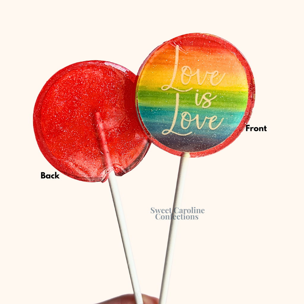 Love is Love lollipops in a rainbow theme, red candy back and lots of sparkle throughout!