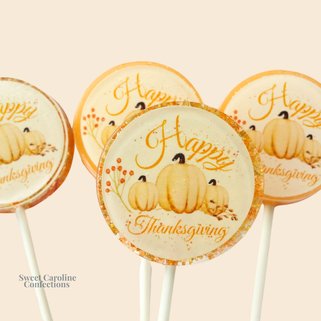 Happy Thanksgiving lollipops in soft peachy and orange tones, matching sparkles inside our signature clear sparkle candy.