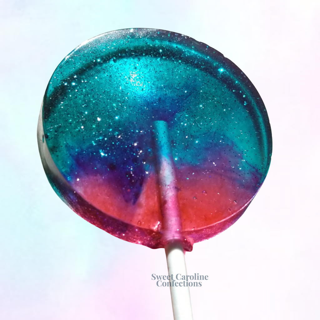 Each lollipop is different, blue/teal and a hot pink candy which sometimes combines to make purple. And of course, edible glitter!