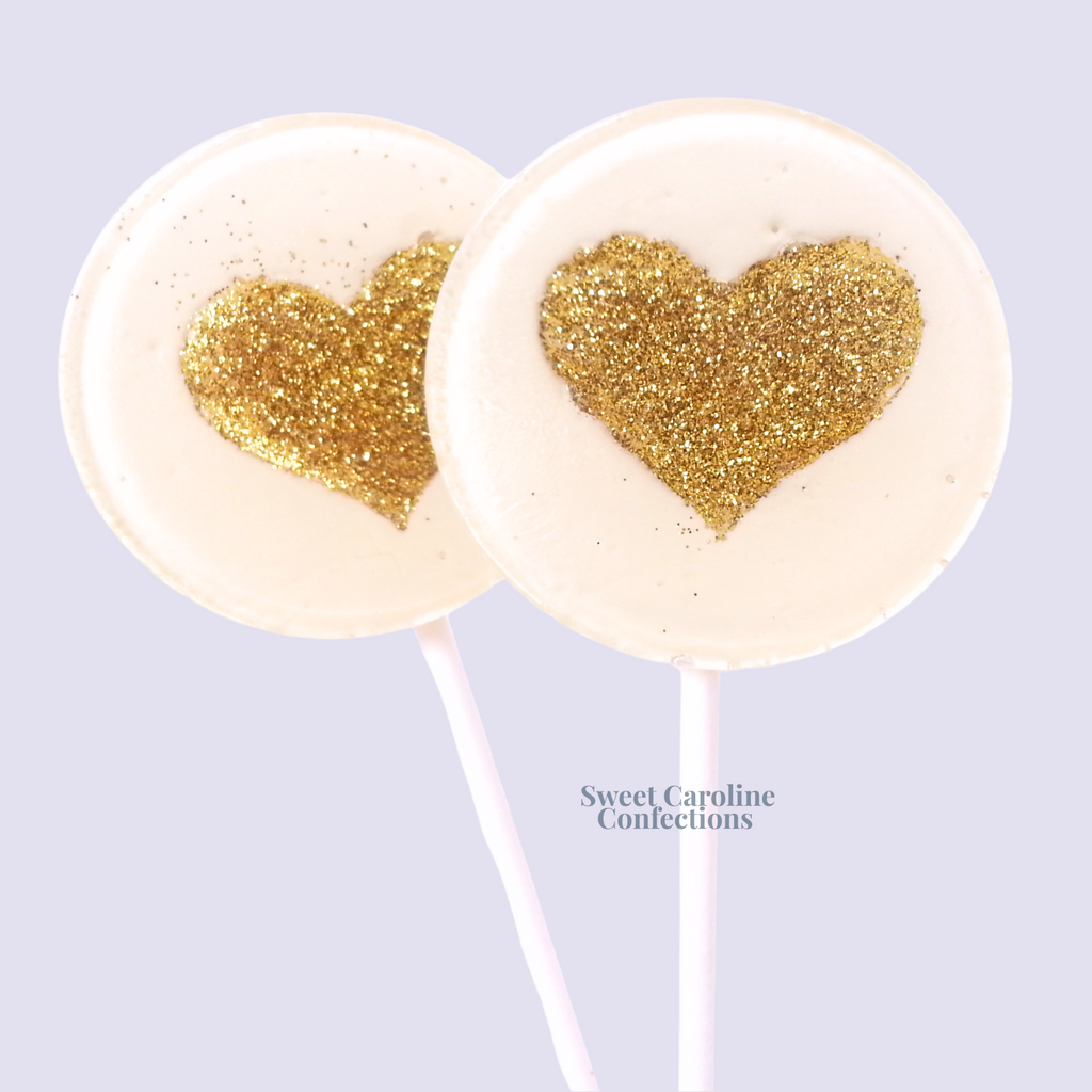 00344 WHITE AND GOLD HEART - Sweet Caroline Confections | The Original Sparkle Lollipops