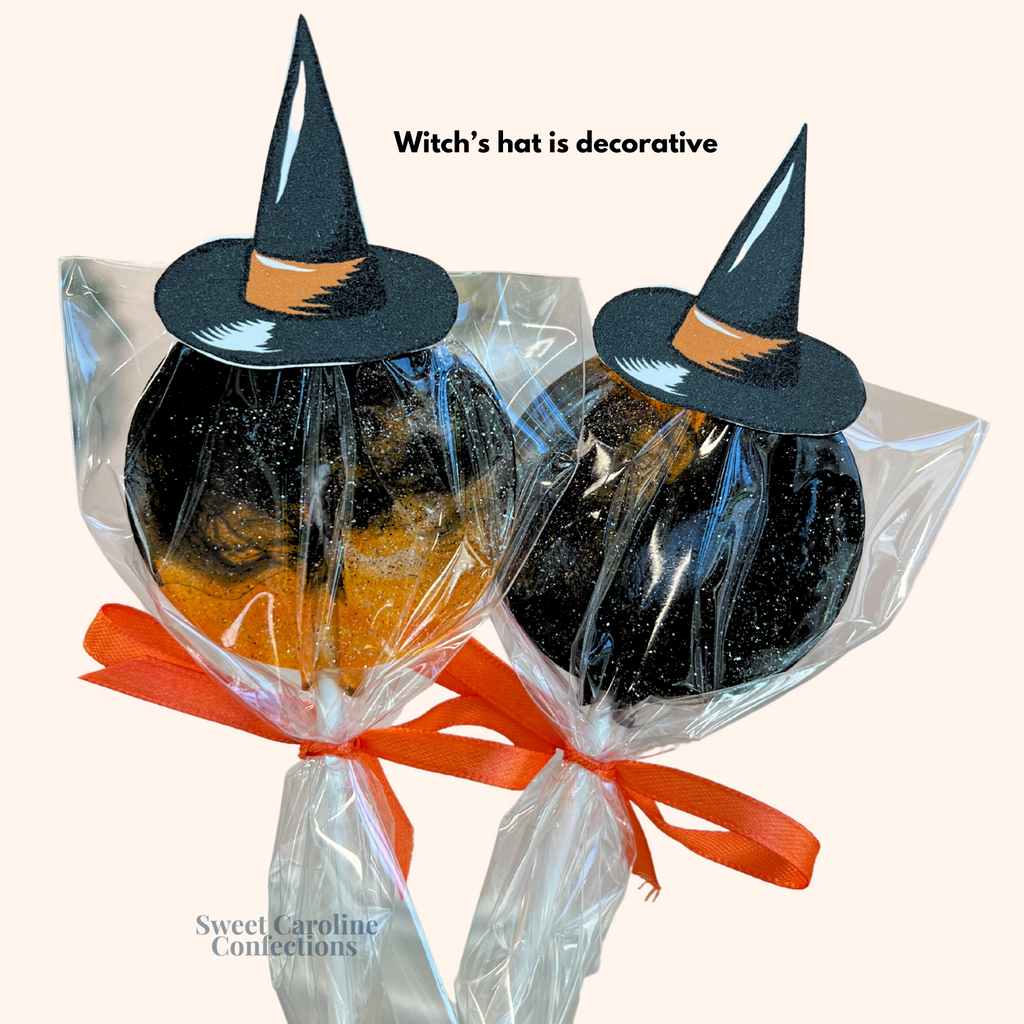 Pitch black hard candy lollipops with burnt orange edible glitter.