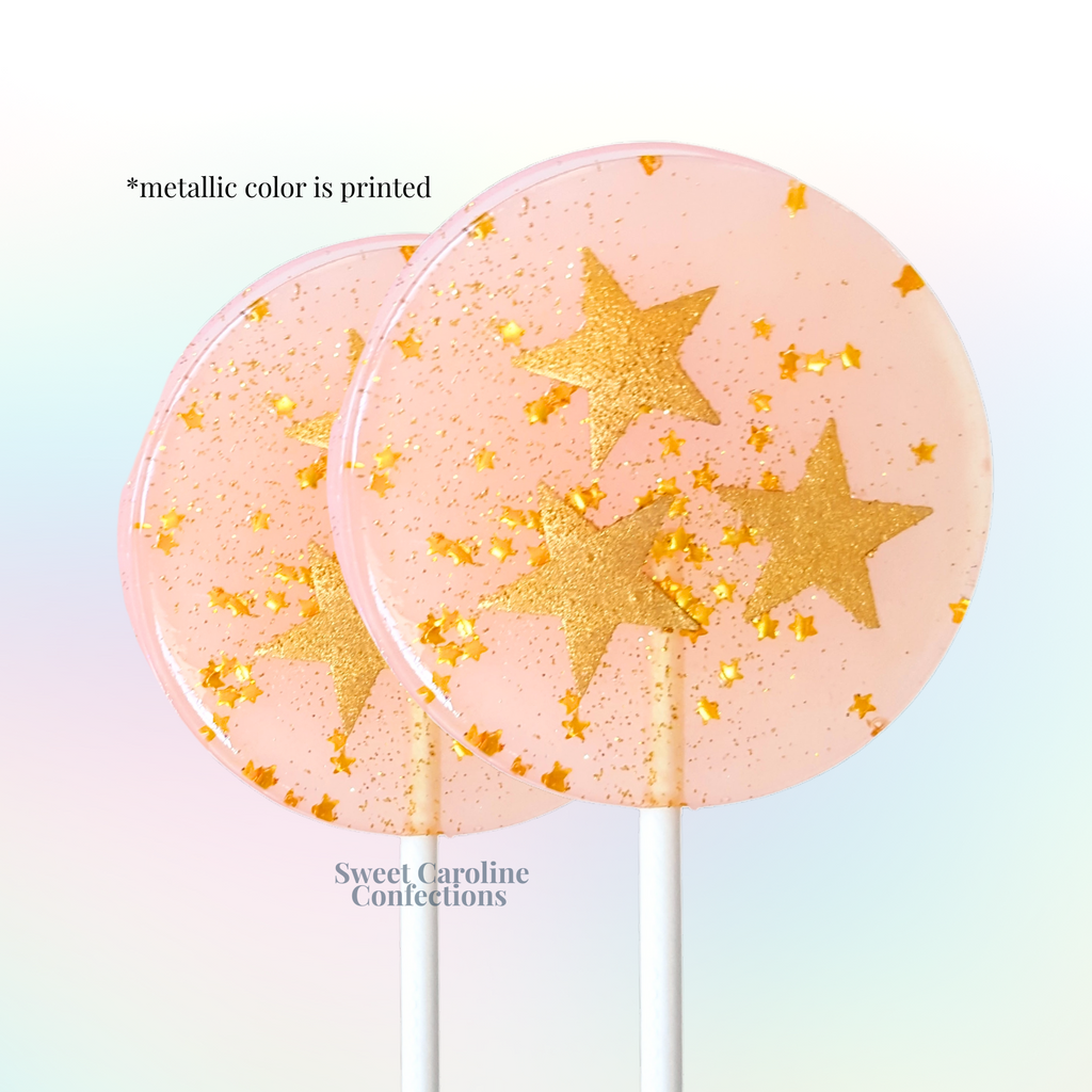 Gorgeous light pink candy with three hand-painted gold stars, surrounded by tiny edible stars and edible gold glitter.