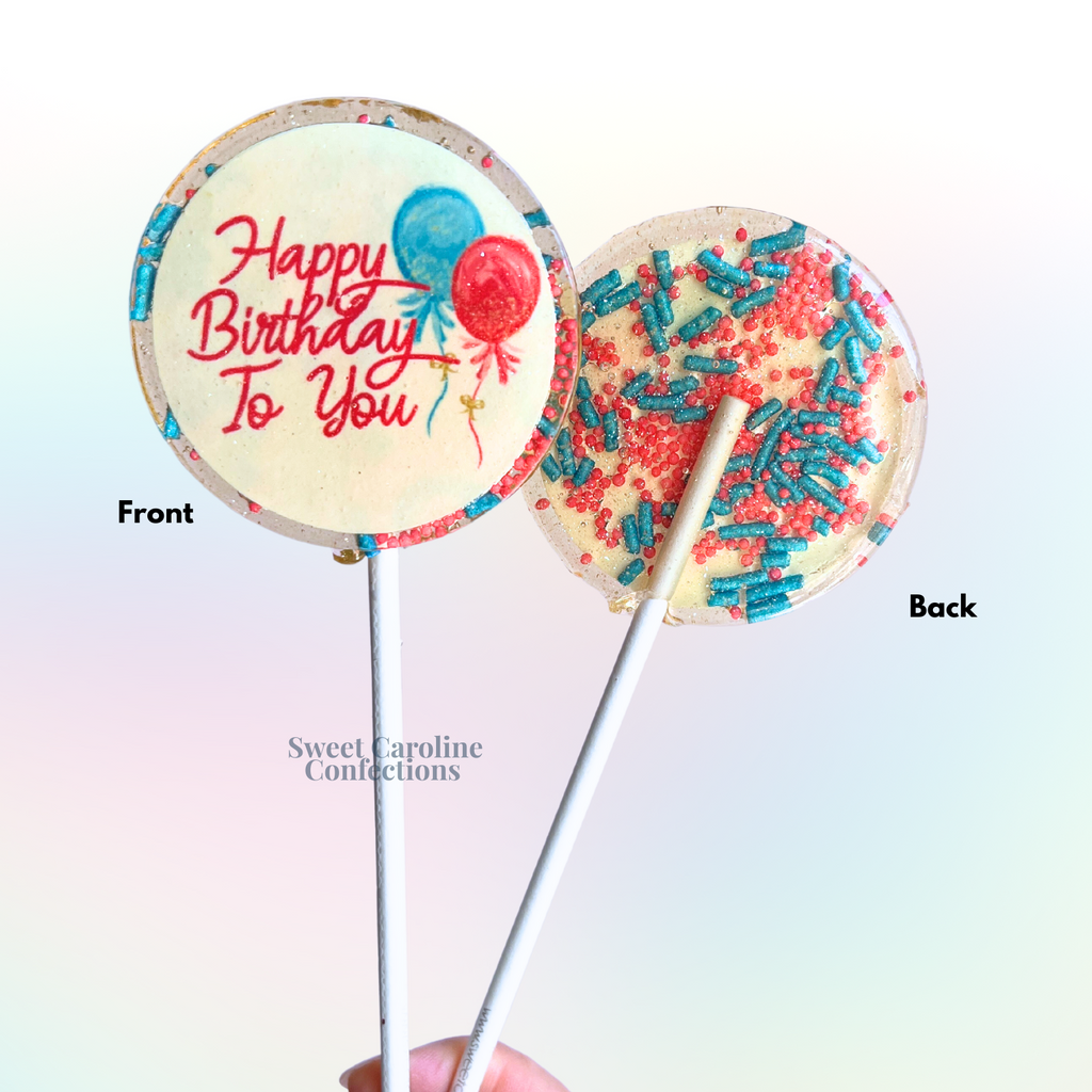 We are in love with these birthday lollipops! "Happy Birthday to you" with a pink and blue balloon, along with matching sparkles in the back.