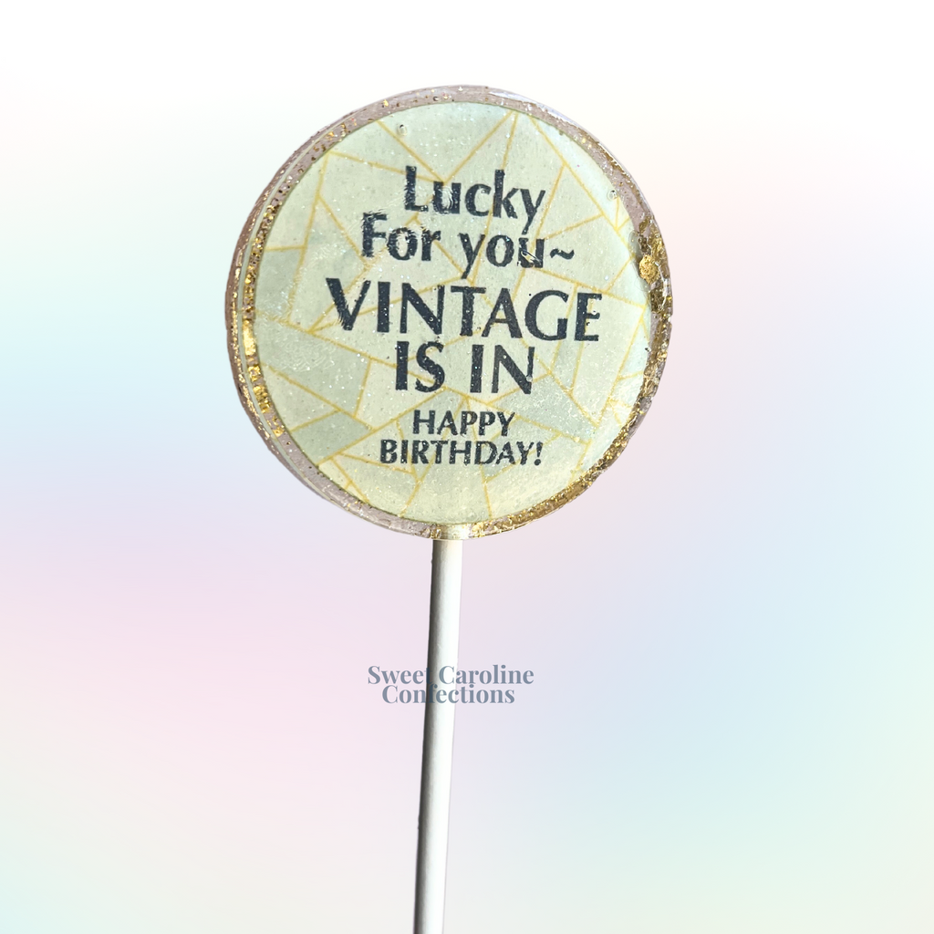 Lucky for You Vintage is In! Celebrate your person with these fun lollipops. Surrounded by gold edible accents.