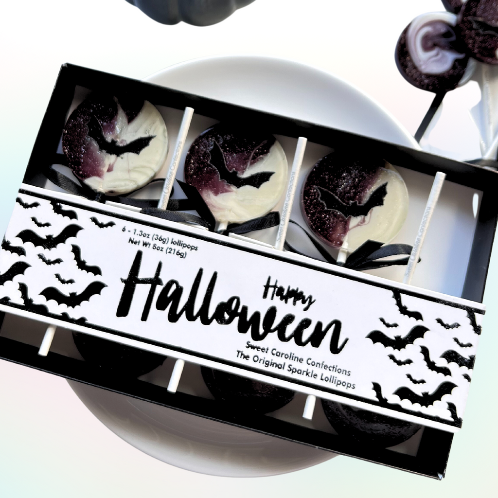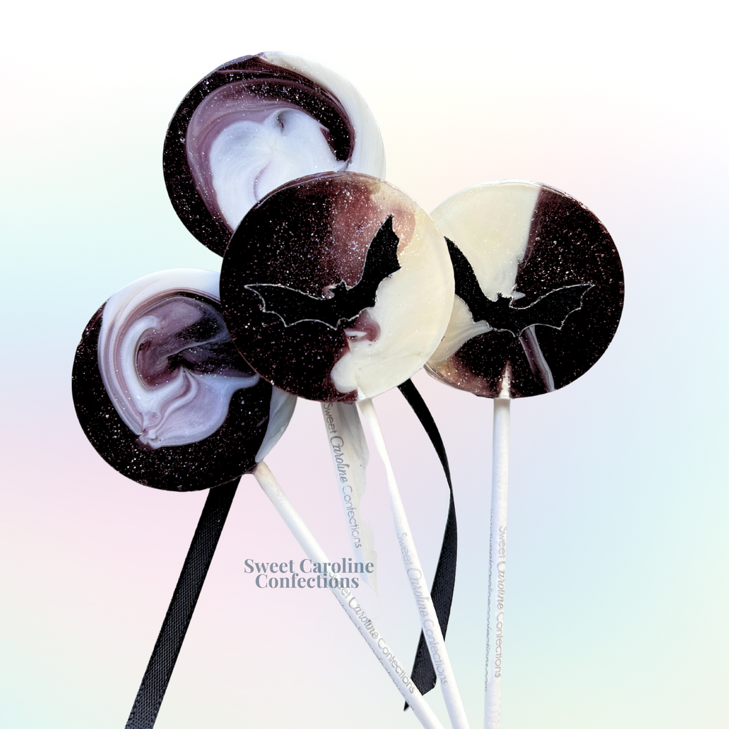 Our boxes are designed in-house. Bat themed lollipops are 100% edible and have an awesome black and white swirly candy design.